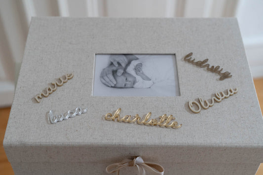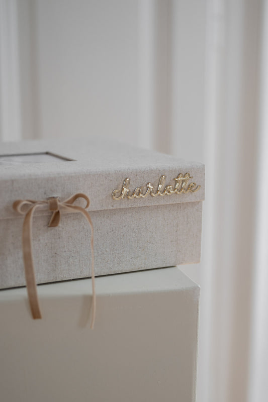 Personalisierte Erinnerungsbox - XL Baby Erinnerungsbox aus Leinen - KALLIGRAPHIE