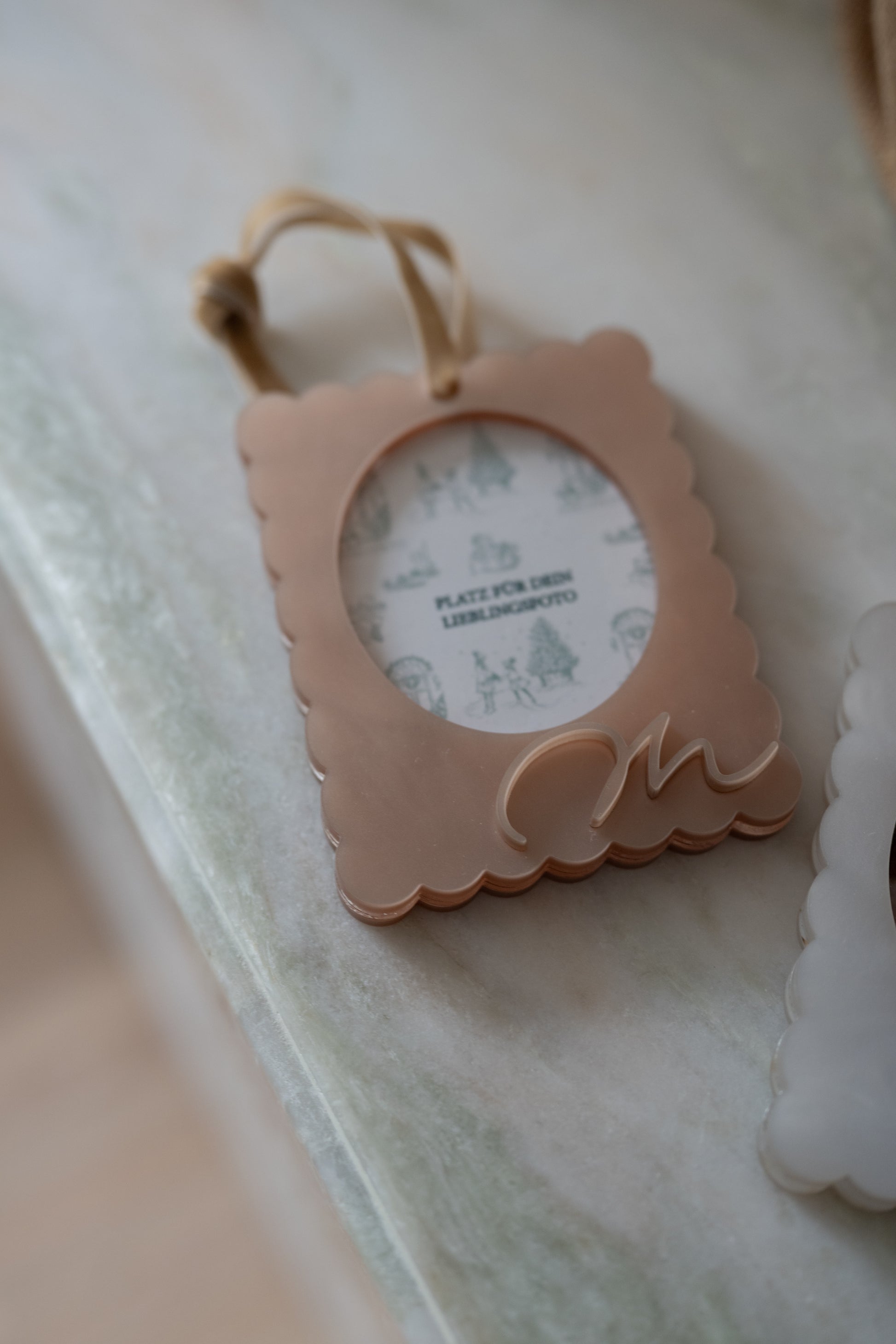 Unser personalisierter Bilderrahmen-Anhänger aus perlmuttfarbenem Acryl bewahrt deine liebsten Momente auf ganz besondere Weise. Mit seiner zarten Wellenform und dem feinen Samtband fügt er sich harmonisch in jede Weihnachtsdekoration ein.