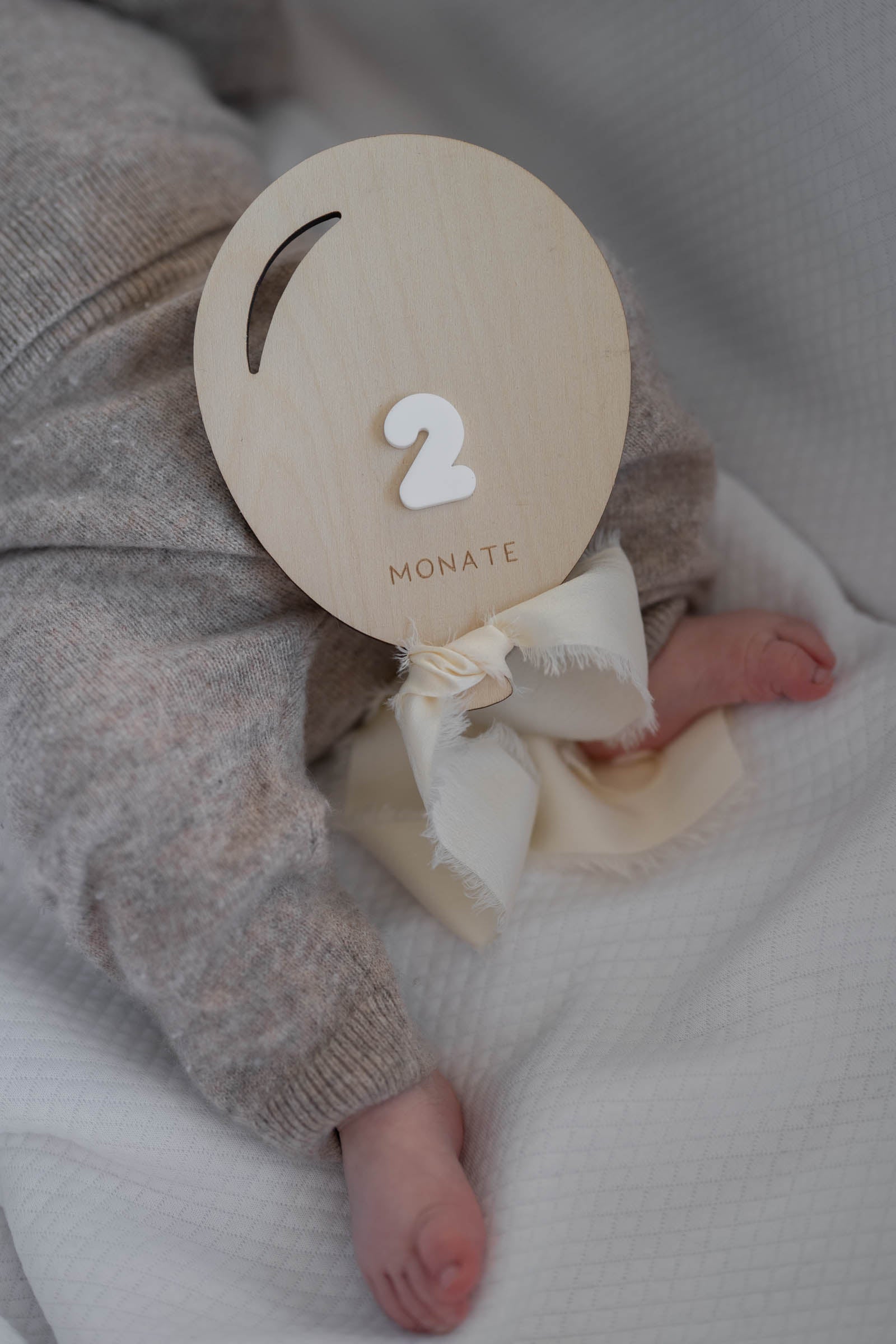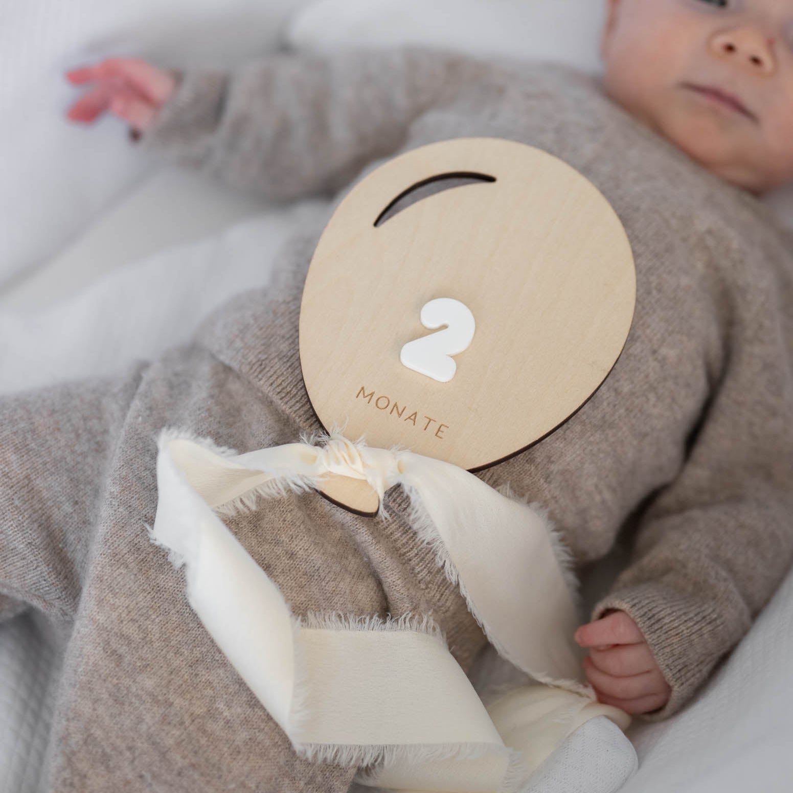 Mit unserer nachhaltigen Luftballon Meilensteinkarte aus Buchenholz und Zahlen aus Acryl gelingen die Baby Monatsbilder ganz leicht. Das Set reicht bis zum 21. Monat, die 1 gibt es für den 11. Monat doppelt.