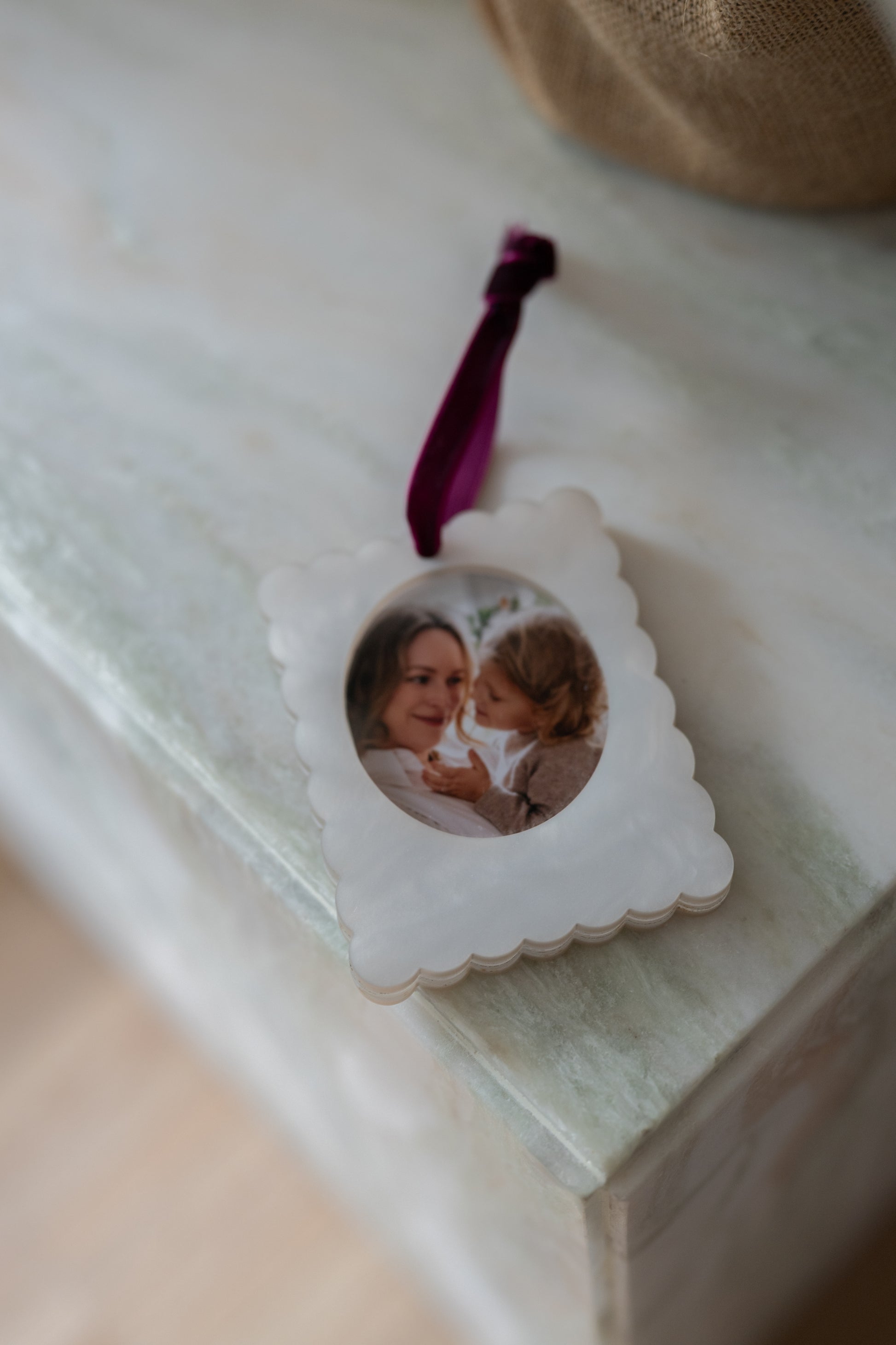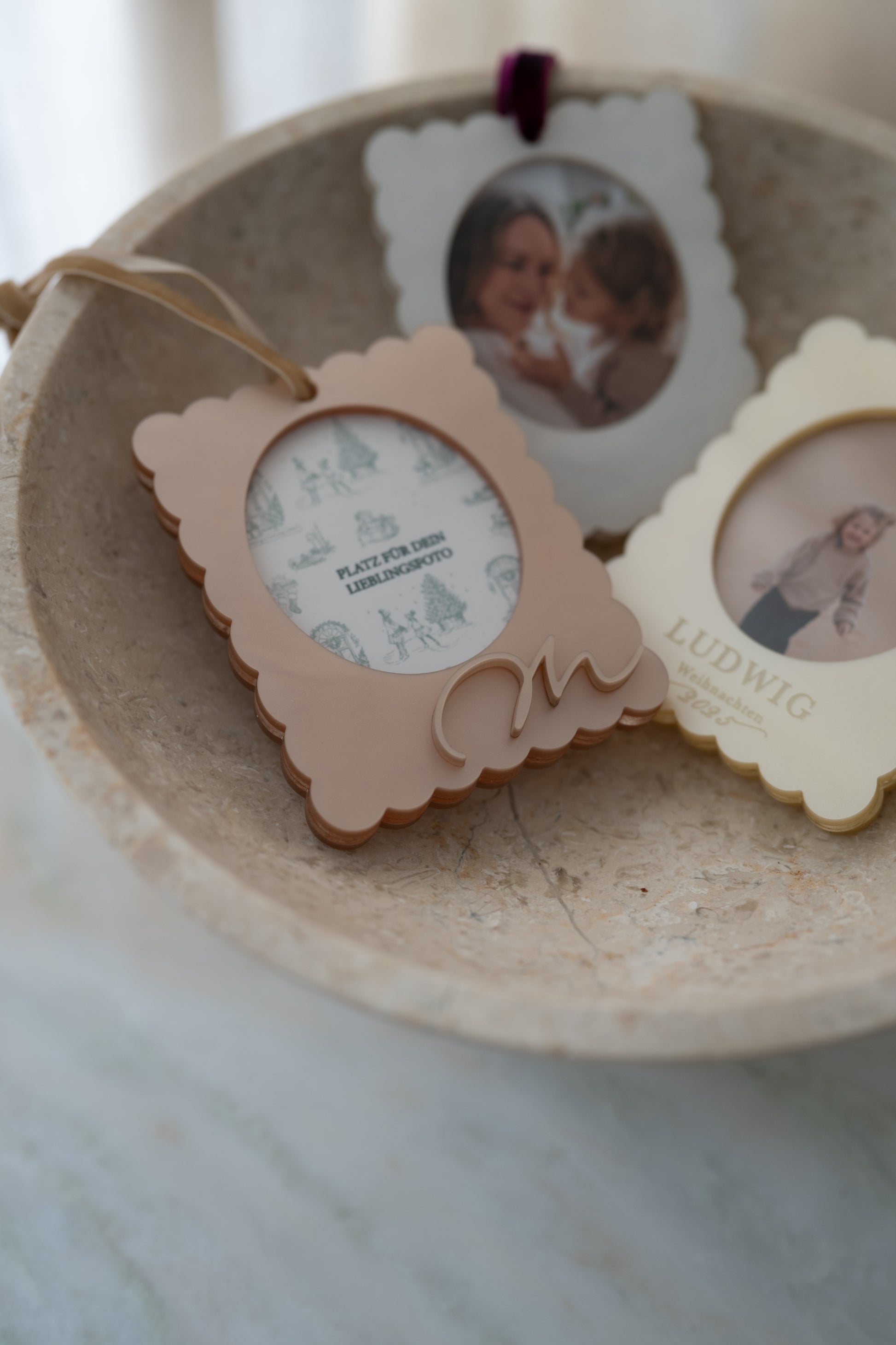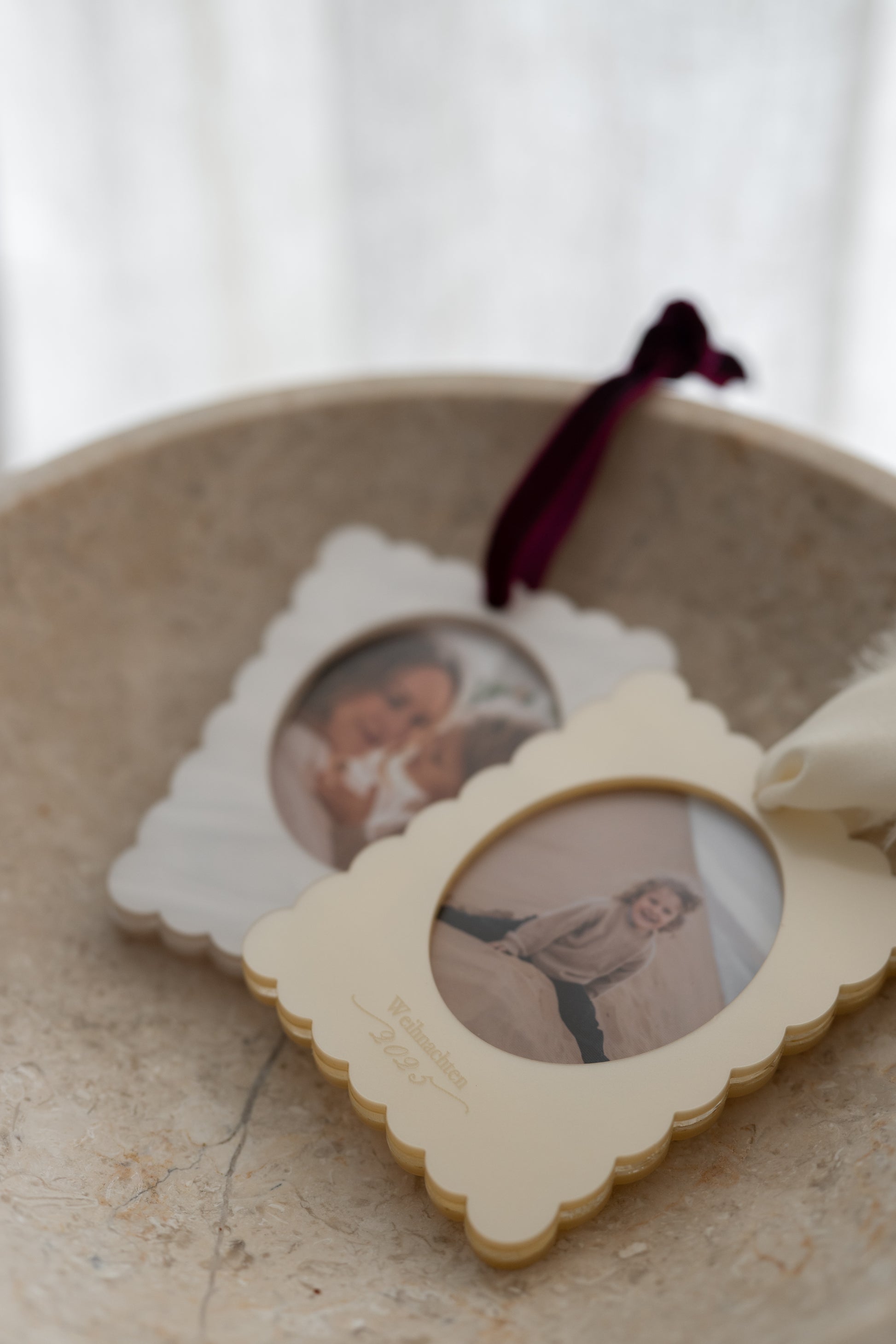 Unser personalisierter Bilderrahmen-Anhänger aus perlmuttfarbenem Acryl bewahrt deine liebsten Momente auf ganz besondere Weise. Mit seiner zarten Wellenform und dem feinen Samtband fügt er sich harmonisch in jede Weihnachtsdekoration ein.
