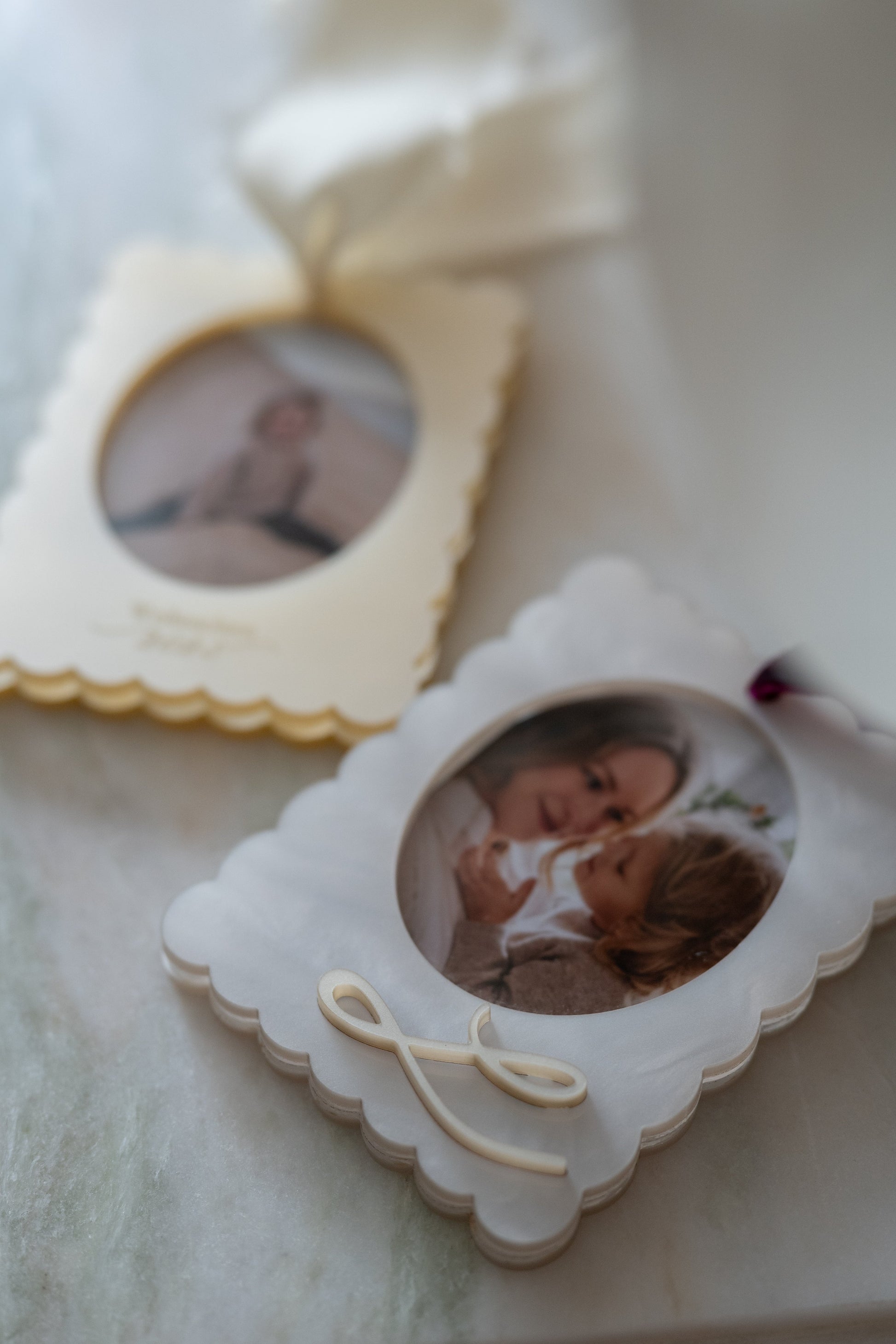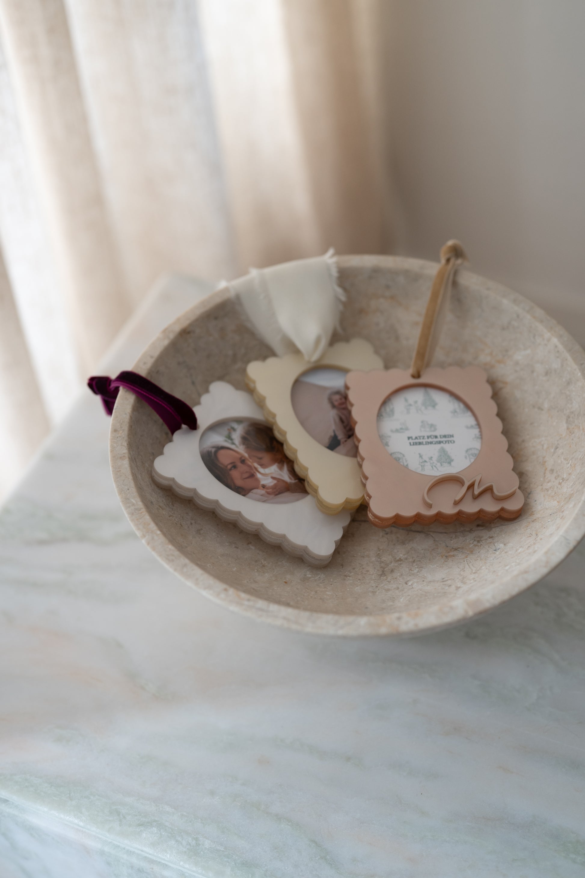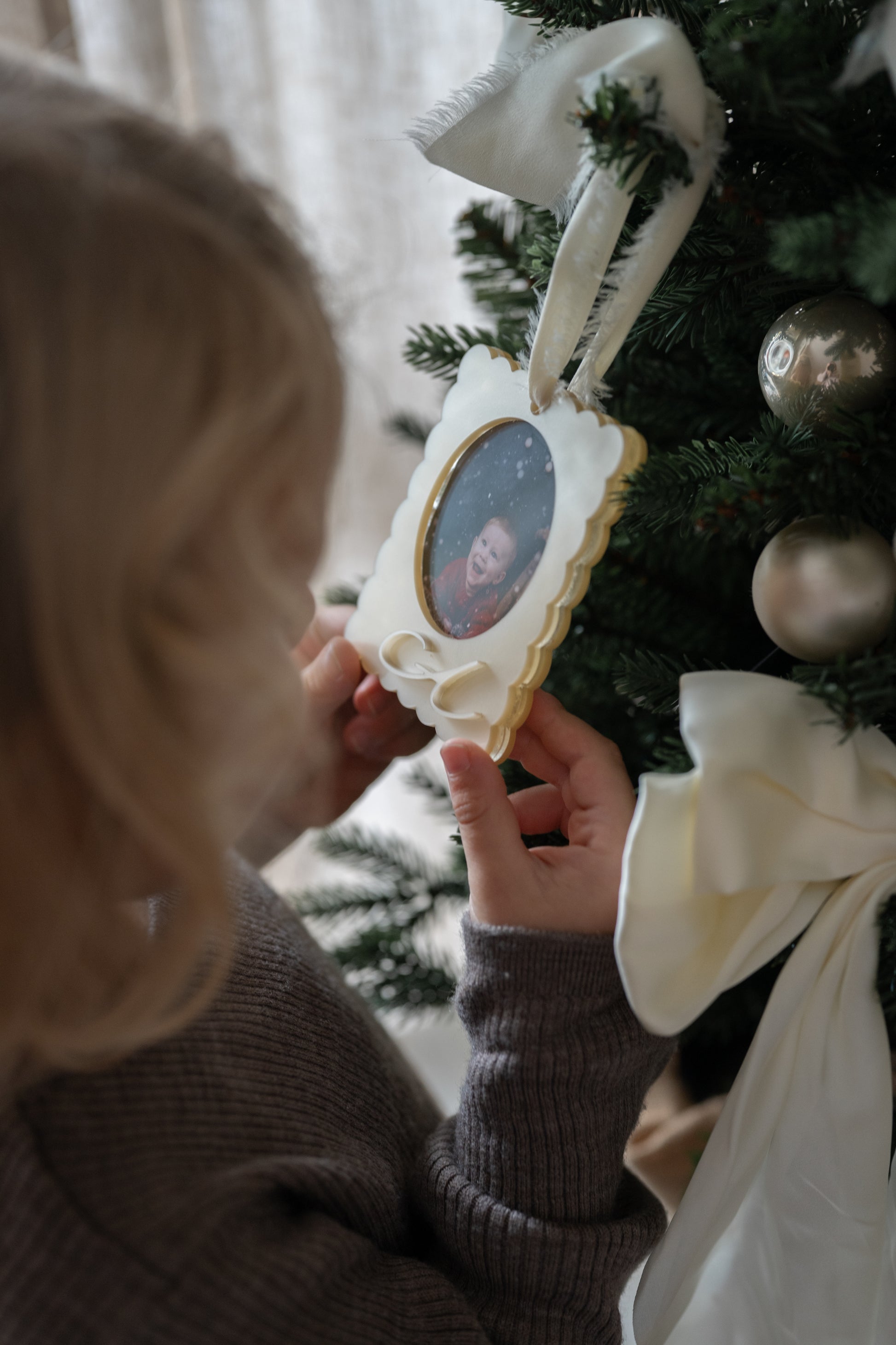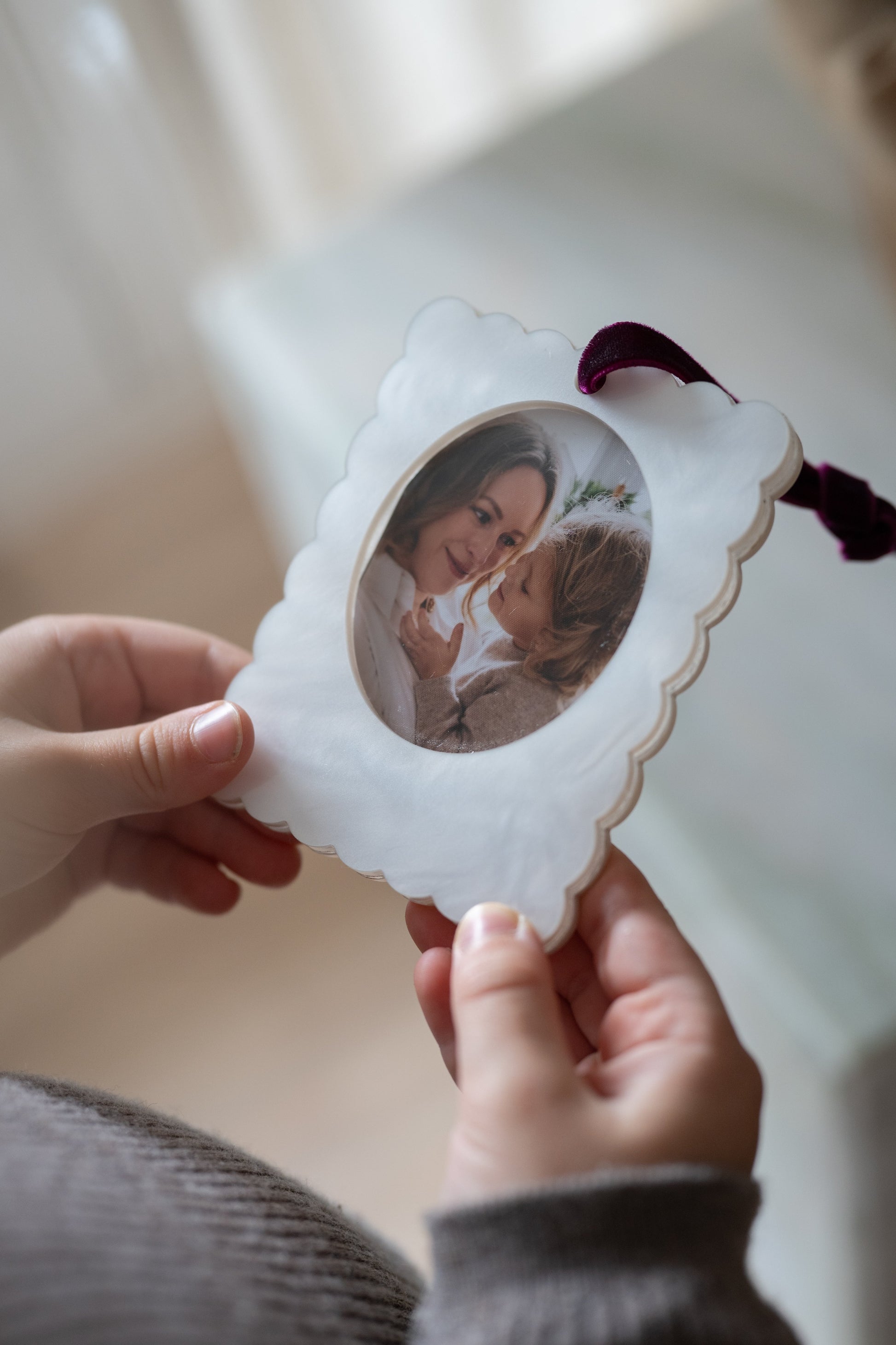 Unser personalisierter Bilderrahmen-Anhänger aus perlmuttfarbenem Acryl bewahrt deine liebsten Momente auf ganz besondere Weise. Mit seiner zarten Wellenform und dem feinen Samtband fügt er sich harmonisch in jede Weihnachtsdekoration ein.